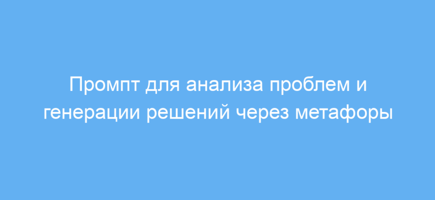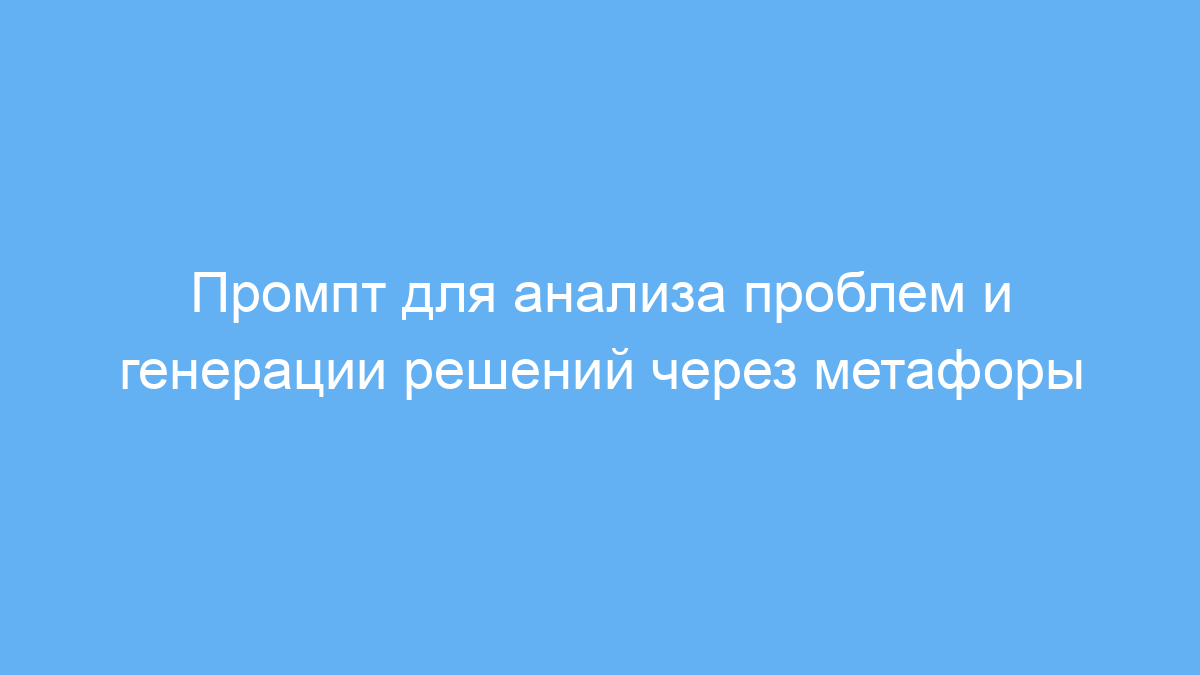Этот промпт предназначен для специалистов, аналитиков, консультантов и руководителей, которым необходимо глубоко проанализировать сложные проблемные ситуации и быстро находить творческие решения. Он помогает структурировать мышление, выявлять ключевые инсайты и формировать новые идеи через использование метафор.
