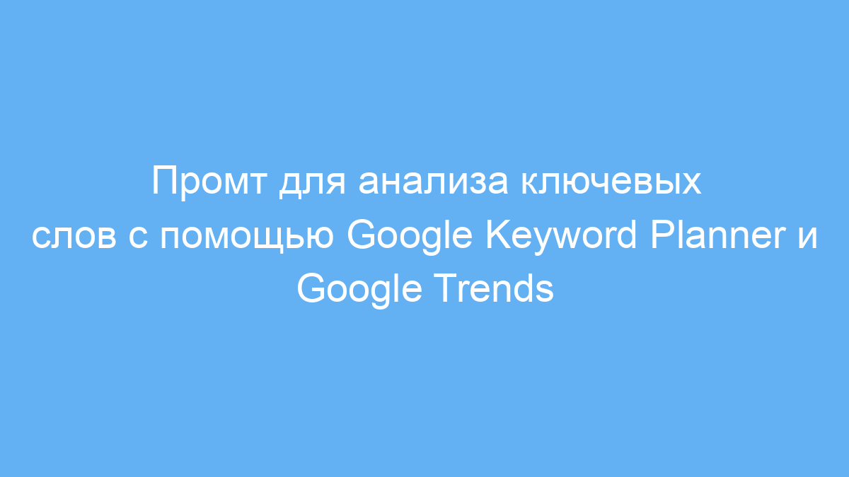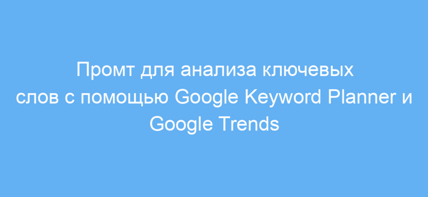 Промт использует данные из Google Keyword Planner и Google Trends, собирает их в удобные таблицы и задаёт пользователю уточняющие вопросы для более детального анализа. Благодаря этому можно подготовить качественную стратегию продвижения и подобрать эффективные ключевые слова с учётом последних изменений в запросах пользователей.