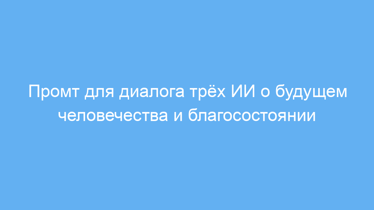 Этот промт предназначен для пользователей нейросетей, которым важно представить сложное обсуждение между разными точками зрения искусственного интеллекта. Он помогает создавать содержательные диалоги, в которых три ИИ с разными характерами обсуждают перспективы будущего человечества и пути быстрого повышения его благосостояния. Такой подход отлично подходит для генерации идей, проведения анализа возможных решений и продумывания стратегий в области социальных, технологических или экономических вопросов.