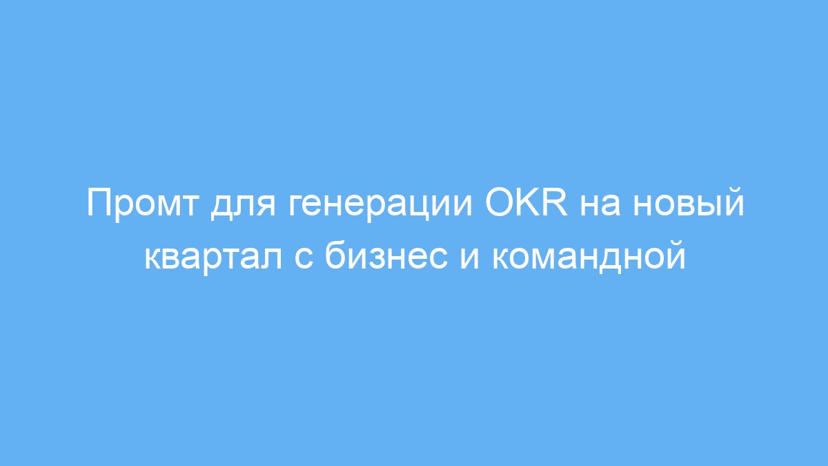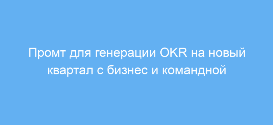 Этот промт предназначен для менеджеров, руководителей команд, бизнес-аналитиков и всех, кто занимается постановкой целей и планированием на квартал с помощью методологии OKR (Objectives and Key Results). Использование такого промта помогает быстро и структурировано сформировать чёткие цели и ключевые результаты как с точки зрения бизнеса, так и внутри команды.