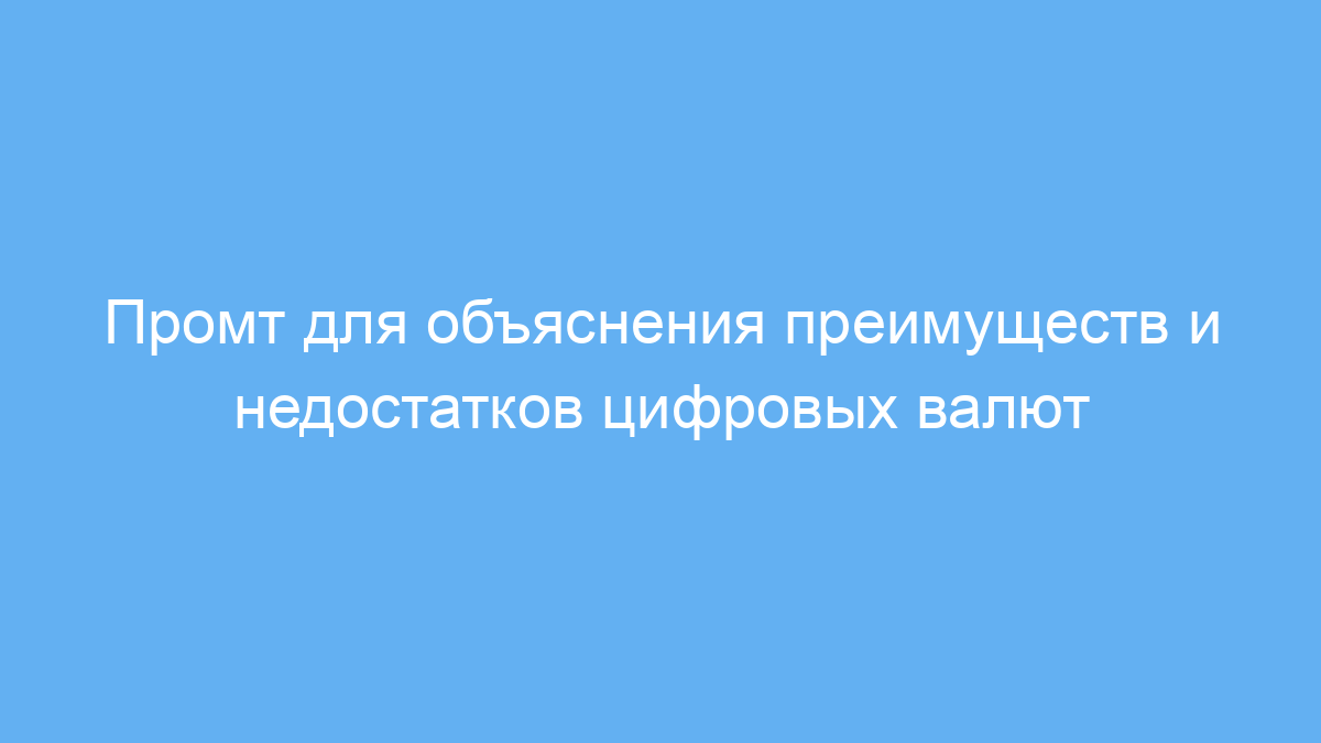 Этот промт экономит время и усилия, позволяя быстро получить структурированное и подробное объяснение сложной темы цифровых валют центральных банков. Он помогает не только получить информацию, но и продолжить диалог, что делает обучение и подготовку к работе более эффективной и интерактивной.