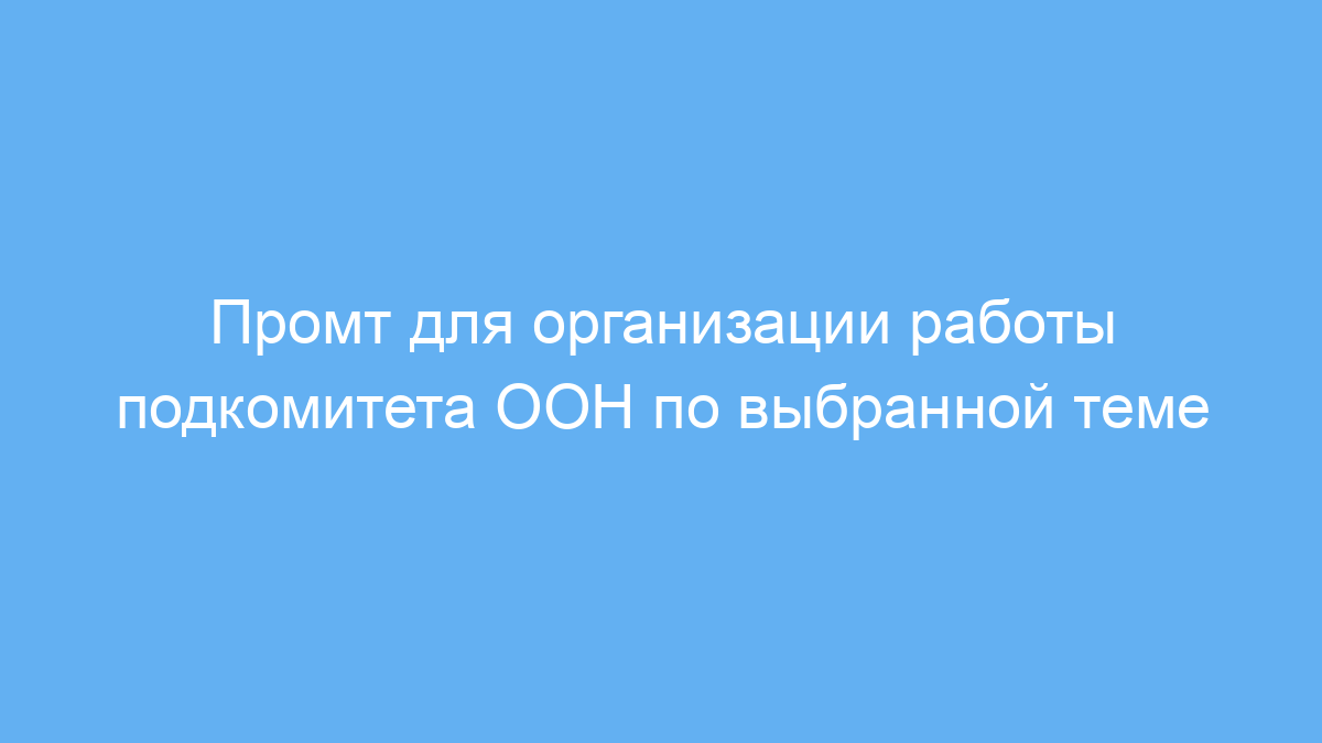 Этот промт предназначен для тех, кто хочет смоделировать процесс управления подкомитетом Организации Объединённых Наций. Он будет полезен студентам, преподавателям, исследователям и специалистам, интересующимся международными дискуссиями, дипломацией и управлением проектами. Промт помогает организовать обсуждение сложной темы с разнообразными экспертами, стимулируя конструктивный диалог и поиск инновационных решений.