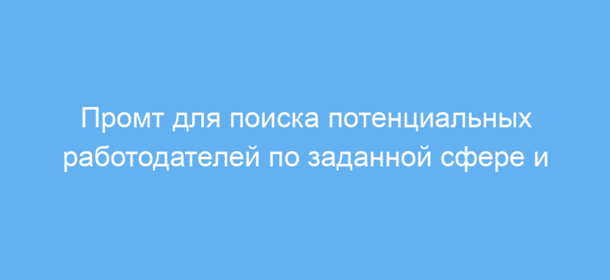 Данный промт существенно экономит время и силы при подборе релевантных работодателей под Ваши интересы и задачи. Он помогает структурировать информацию, учесть особенности рынка и получить обзор с плюсами и минусами для оптимального выбора.