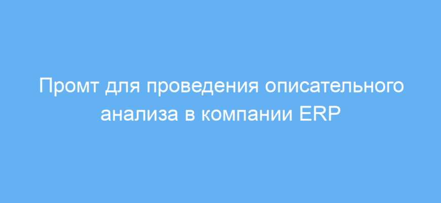 Промт собирает информацию о шагах описательного анализа, методах сбора и обработки данных, а также способах визуализации и интерпретации результатов. С помощью нейросети вы получите подробное руководство, которое можно использовать на практике для улучшения бизнес-процессов в ERP-среде.