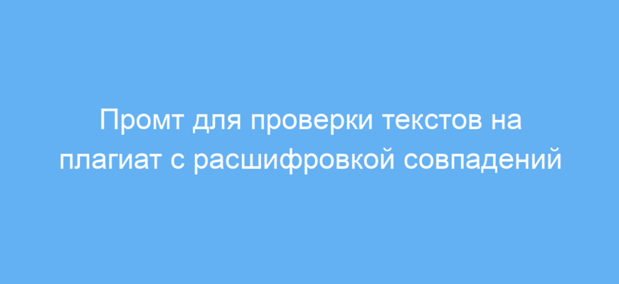 Промт принимает на вход два текста и вычисляет общий процент сходства между ними. Затем он сравнивает похожие предложения из обоих текстов, составляя таблицу, где для каждой пары предложений указан процент их совпадения. В конце промт даёт краткое, чёткое заключение о наличии или отсутствии плагиата. Всё это позволяет быстро и структурировано понять, насколько тексты похожи друг на друга.