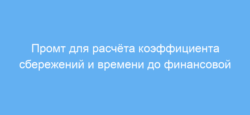 Промт рассчитывает коэффициент сбережений на основе введённых значений годового чистого дохода после налогов и годовых расходов. Кроме того, учитывается ожидаемая доходность инвестиционного портфеля, уровень инфляции и безопасный уровень снятия средств, чтобы оценить, сколько лет потребуется, чтобы накопить достаточный капитал для финансовой независимости.