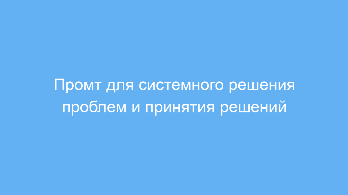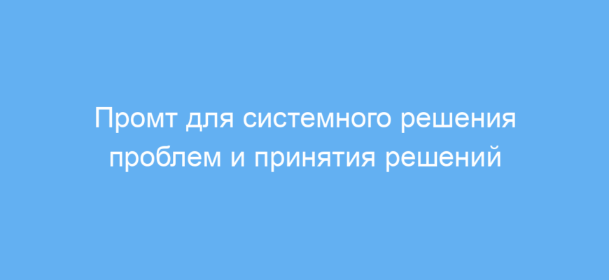 Промт решает задачи системного анализа и принятия решений, позволяя не упустить важные этапы: от определения проблемы и заинтересованных сторон до оценки рисков и финансовых затрат. Он упрощает процесс, структурируя действия и обеспечивая последовательность, что особенно полезно при работе с большими объемами информации и необходимости учитывать различные точки зрения.
