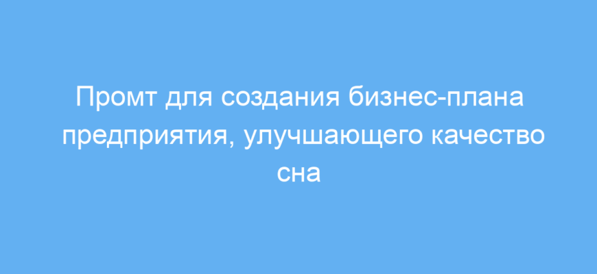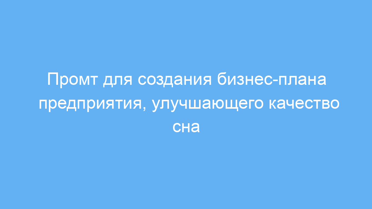 Этот промт предназначен для предпринимателей, стартаперов, консультантов и маркетологов, которые хотят разработать подробный бизнес-план для компании, ориентированной на улучшение сна. Он помогает быстро структурировать идеи и сформулировать ключевые аспекты бизнеса, связанные с услугами по улучшению качества отдыха.