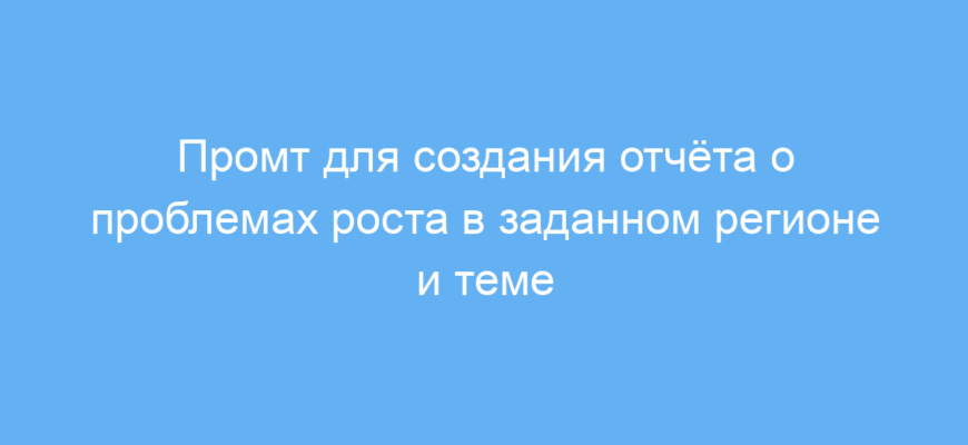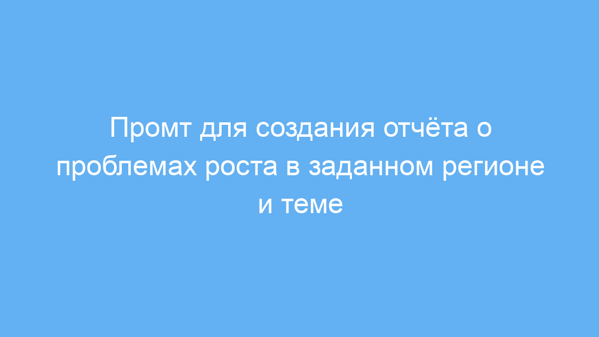 Этот промт предназначен для специалистов, аналитиков, исследователей и студентов, которым необходимо быстро подготовить структурированный отчёт о проблемах экономического роста в определённой сфере и регионе. С его помощью можно систематизировать ключевые аспекты проблемы, выделить основное ограничение роста, а также предложить детальные рекомендации для государственной политики. Это особенно полезно при подготовке докладов, презентаций, учебных работ или стратегических документов.