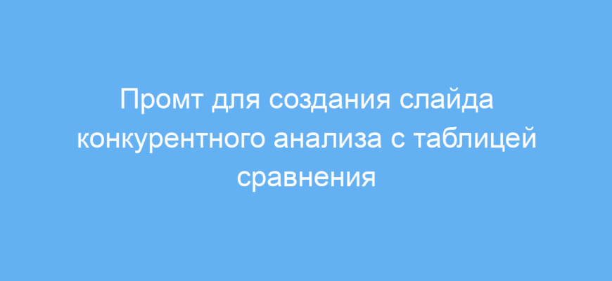 Принцип работы прост: необходимо ввести названия компаний и список критериев для сравнения. Промт преобразует эту информацию в понятную таблицу, пригодную для вставки в слайд презентации. В результате пользователь получает готовую к использованию структуру, сэкономив время на оформлении и анализе.