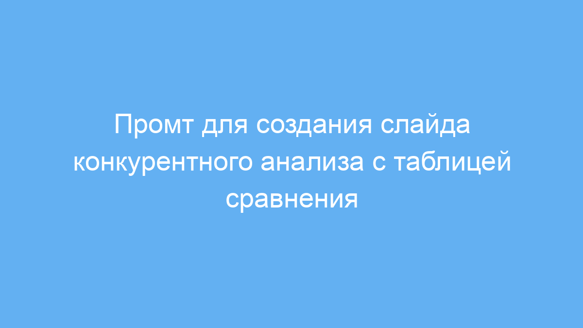 Этот промт предназначен для тех, кто хочет быстро и наглядно провести конкурентный анализ в виде презентационного слайда. Он помогает структурировать сравнение нескольких компаний по заданным критериям, формируя таблицу, которая удобно демонстрируется на слайде. Это полезно как маркетологам, менеджерам проектов, аналитикам, так и студентам, которые готовят исследования или бизнес-презентации.