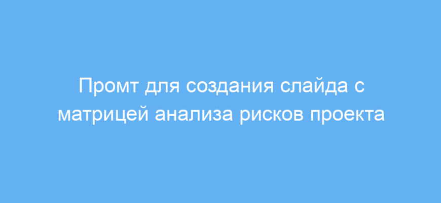 Этот промт предназначен для специалистов, руководителей проектов, аналитиков и студентов, которым нужно быстро и наглядно представить анализ рисков проекта. Основная задача промта — сформировать слайд, где риски оцениваются и структурируются в матрицу, что помогает лучше понять потенциальные проблемы и принять обоснованные решения.