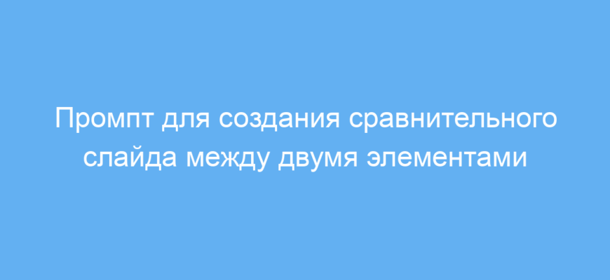 Как работает промпт: вы задаёте два сравниваемых объекта, и нейросеть генерирует сравнительный слайд с выделением ключевых преимуществ каждого. Визуальное оформление выполнено в бизнес-стиле, что подходит для профессиональных презентаций и отчетов.