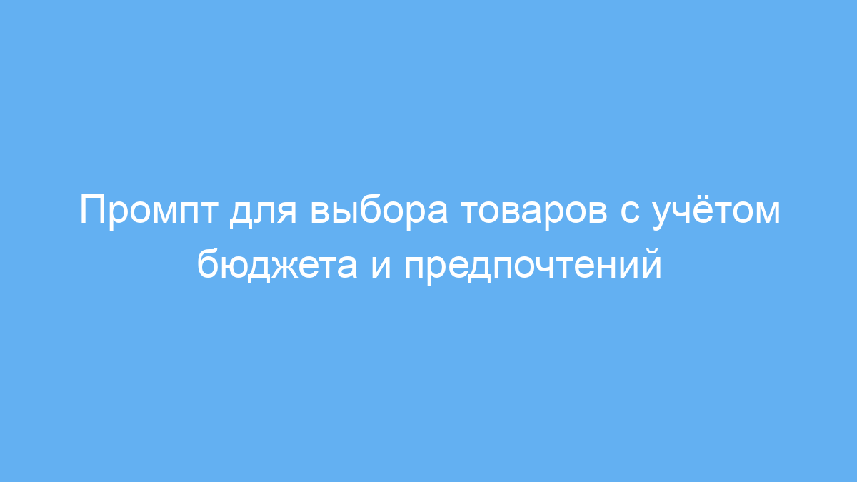 Этот промпт предназначен для пользователей, которые хотят получить список рекомендаций товаров, соответствующих их бюджету и личным предпочтениям. Он особенно полезен для тех, кто ищет подходящие варианты покупок быстро и без лишней информации. Промпт помогает сэкономить время при поиске, избегая самостоятельного просмотра множества товаров на сайтах или в магазинах.