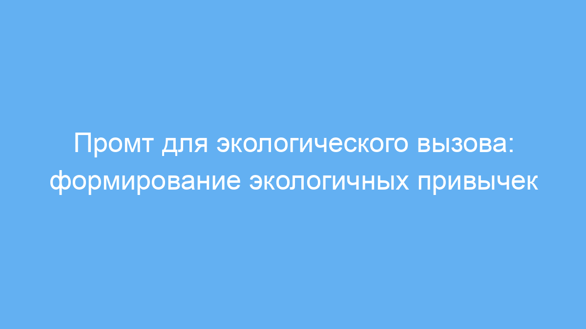 Этот промт создан для разработчиков чатботов, которые хотят вовлечь пользователей в Экологический Вызов. Он помогает пользователям сформировать устойчивые экологичные привычки в шести важных категориях: вода, отходы, энергия, питание, транспорт и природа. Главная задача промта — организовать удобный и понятный процесс обучения и мотивации через интерактивный диалог.