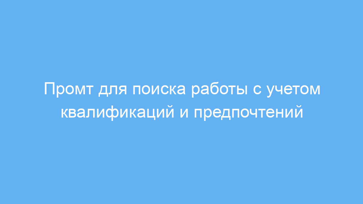 Этот промт предназначен для тех, кто ищет работу и хочет получить персональные рекомендации по вакансиям. Он особенно полезен людям, которые хотят найти работу, учитывая свои квалификации, опыт и личные предпочтения по условиям труда. Промт помогает сэкономить время, автоматизируя поиск вакансий, и повышает шансы найти подходящую должность, анализируя резюме и пожелания пользователя.