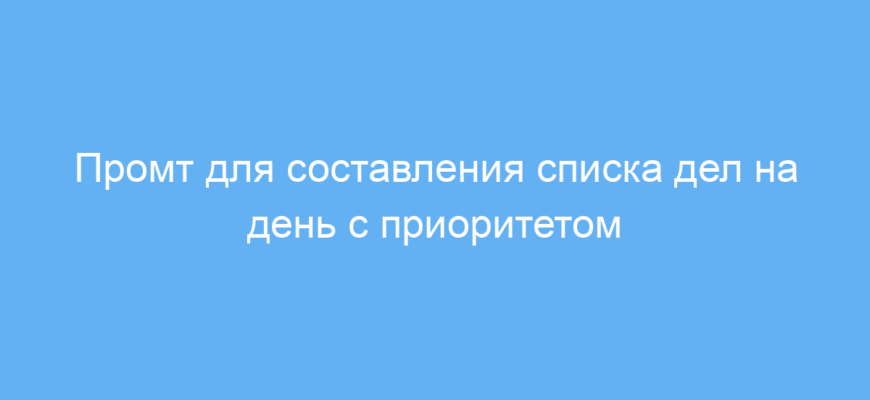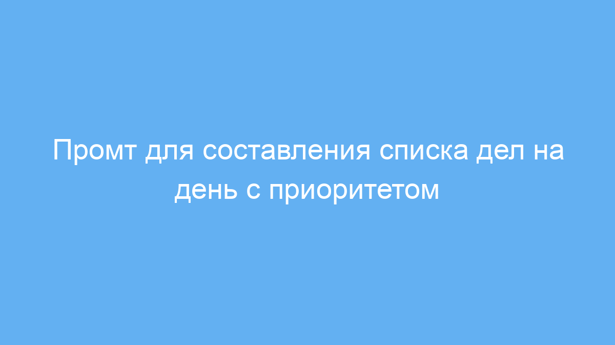 Промт помогает систематизировать задачи, выделить ключевые дела, не пропустить важные сроки и повысить продуктивность. Он создает упорядоченный список задач на день, обращая особое внимание на приоритет — то есть самые значимые дела в начале списка.