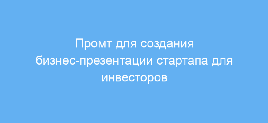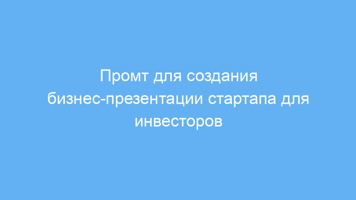 Этот промт предназначен для предпринимателей, стартаперов, бизнес-консультантов и маркетологов, которым нужно быстро и профессионально подготовить убедительную презентацию стартапа для потенциальных инвесторов. Часто составление такой презентации вызывает сложности из-за большого объема информации и необходимости подать её чётко и структурировано.