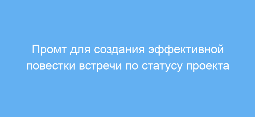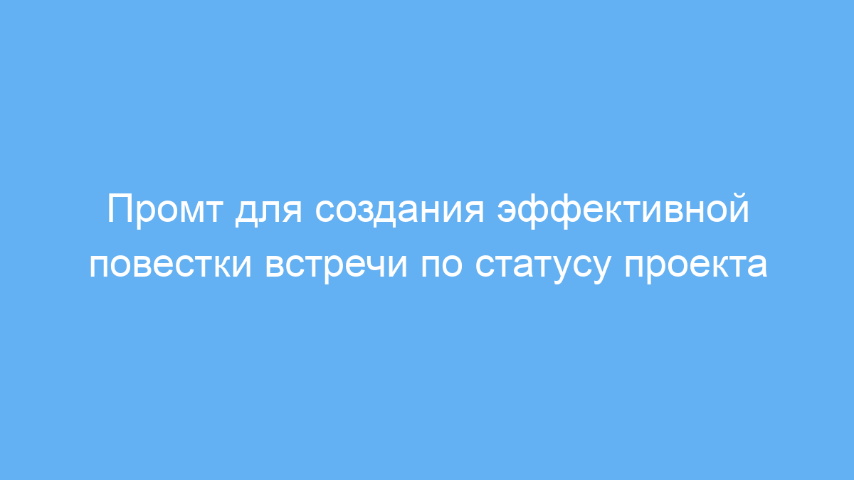 Этот промт создан для руководителей проектов, организаторов совещаний, менеджеров и всех, кто отвечает за проведение продуктивных встреч. Он поможет быстро спроектировать четкую и структурированную повестку для обсуждения статуса проекта.