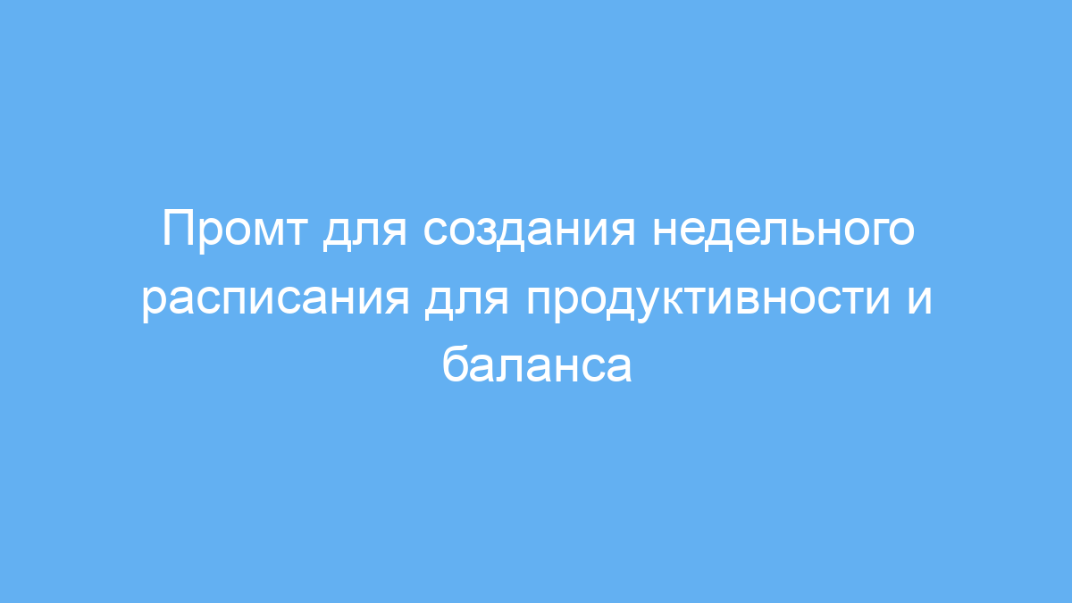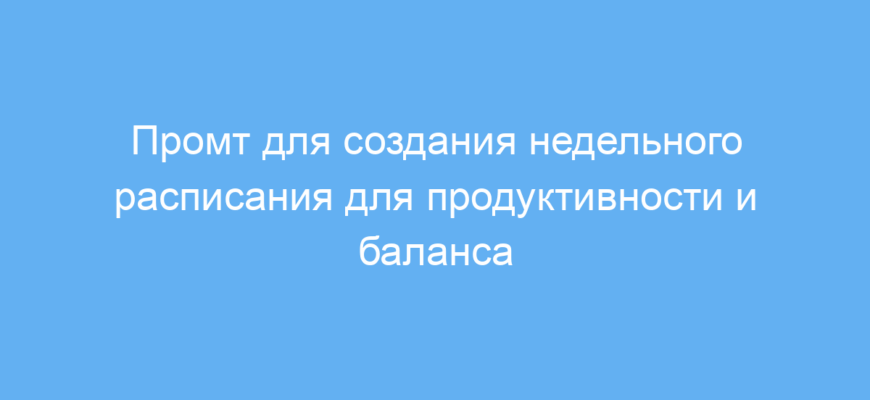 Данный промт предназначен для тех, кто хочет структурировать своё недельное время так, чтобы повысить продуктивность и сохранить баланс между работой, отдыхом и личными увлечениями. Он помогает планировать разные виды активности — например, работу, упражнения, хобби и восстановление — в одном расписании, чтобы использовать время максимально эффективно. Основная идея в том, чтобы видеть всю неделю целиком и качественно распределять время между делами, не забывая об отдыхе.