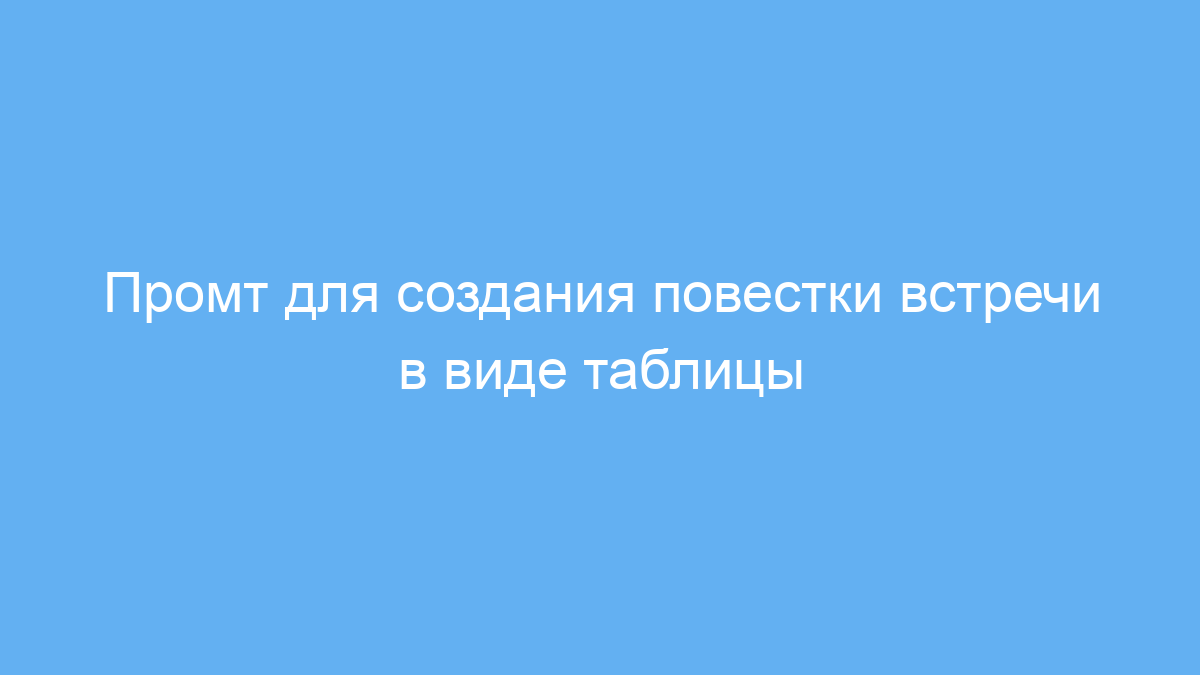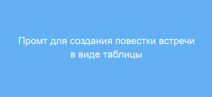 Промт работает так: пользователь отвечает на три основных вопроса — какую цель преследует встреча, кто в ней участвует и сколько она длится. На основе этих данных нейросеть генерирует повестку в удобной таблице с колонками «Тема повестки», «Ведущий» и «Продолжительность». Такой формат позволяет наглядно видеть структуру встречи и распределение времени между пунктами.