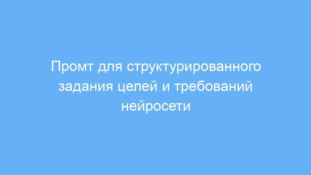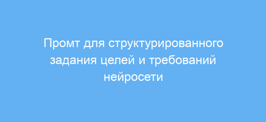 Этот промт предназначен для пользователей, которые хотят четко и последовательно формулировать задачи для нейросетей. Он помогает структурировать цель, ожидаемые результаты, требования и ограничения перед началом работы с ИИ. Такой подход упрощает как создание сложных запросов, так и получение точных и полезных ответов.