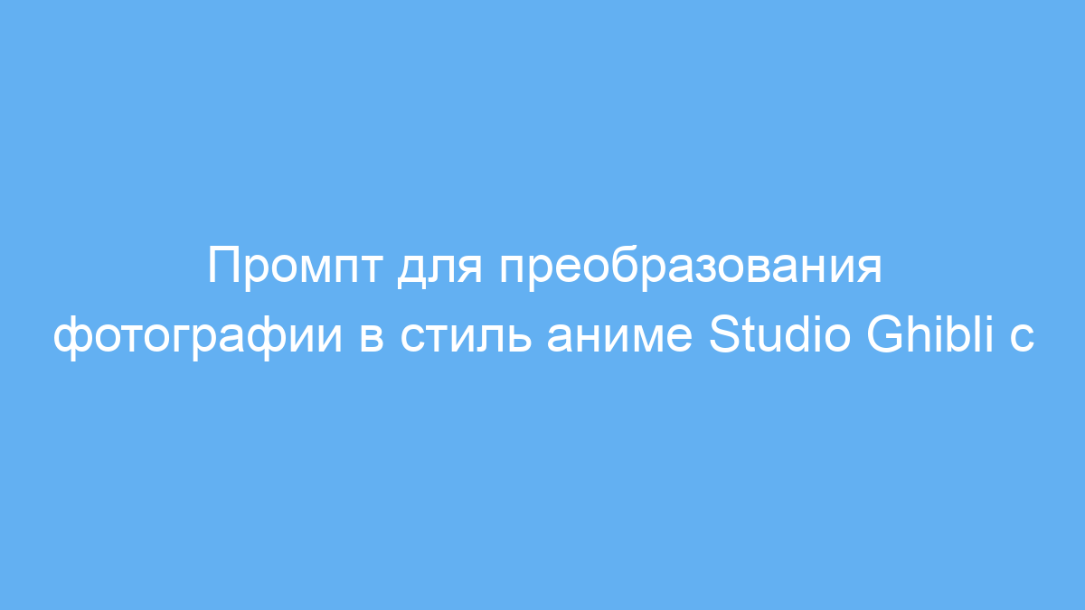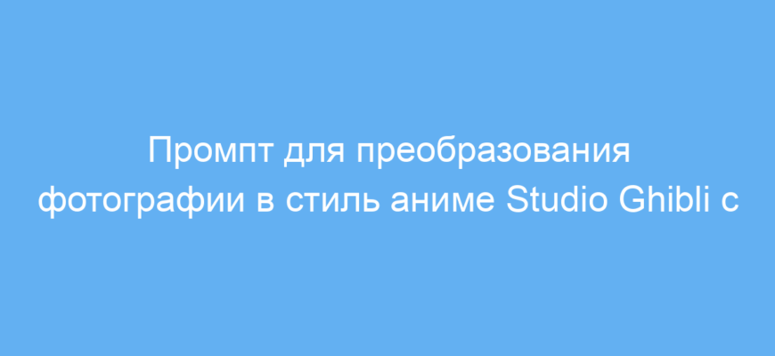 Использование такого промпта помогает быстро получить сложное по стилистике изображение без необходимости изучать сложные графические программы или рисовать вручную. Нейросеть интерпретирует описание и преобразует фотографию, сочетая тёплую и сказочную стилистику Studio Ghibli с футуристическими элементами и атмосферой киберпанка.