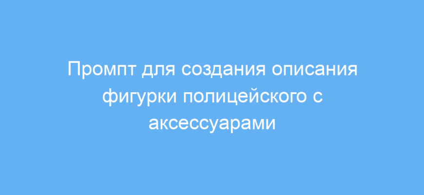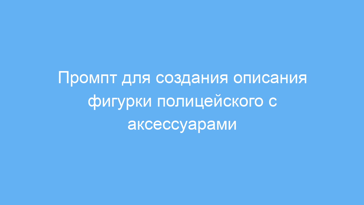 Этот промпт предназначен для тех, кто хочет быстро и качественно получить подробное описание фигурки полицейского в фирменной форме с указанными аксессуарами. Он особенно полезен дизайнерам, продавцам сувениров, блогерам и авторам контента, которые работают с нейросетями для генерации текстов и образов.