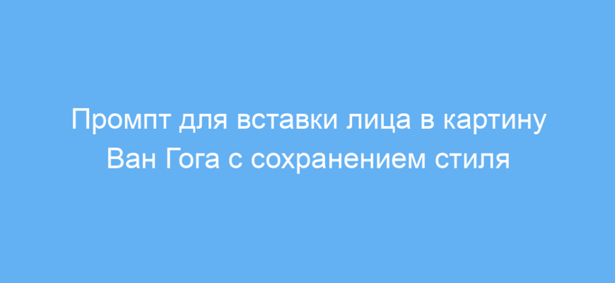Этот промпт создан для тех, кто хочет интегрировать своё лицо в знаменитую картину Ван Гога «Автопортрет с перевязанным ухом». Он подходит художникам, дизайнерам, блогерам и любителям искусства, желающим получить уникальное изображение с сохранением атмосферы и художественного стиля оригинала.