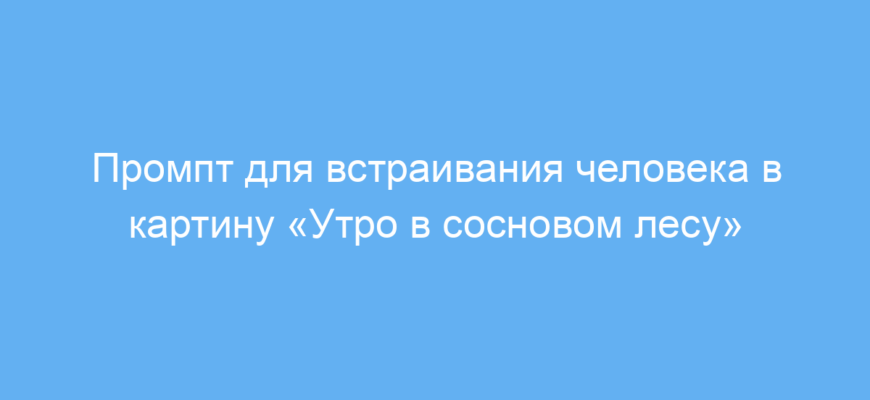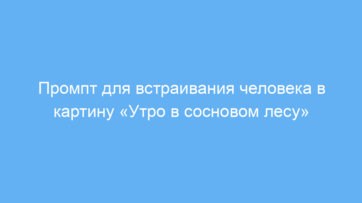 Этот промпт предназначен для художников, дизайнеров, маркетологов и всех, кто работает с нейросетями для создания уникальных художественных изображений. Он помогает добавить изображение человека в известную картину «Утро в сосновом лесу» художника Ивана Шишкина, при этом сохраняя высокую реалистичность и органичность в лесном пейзаже.