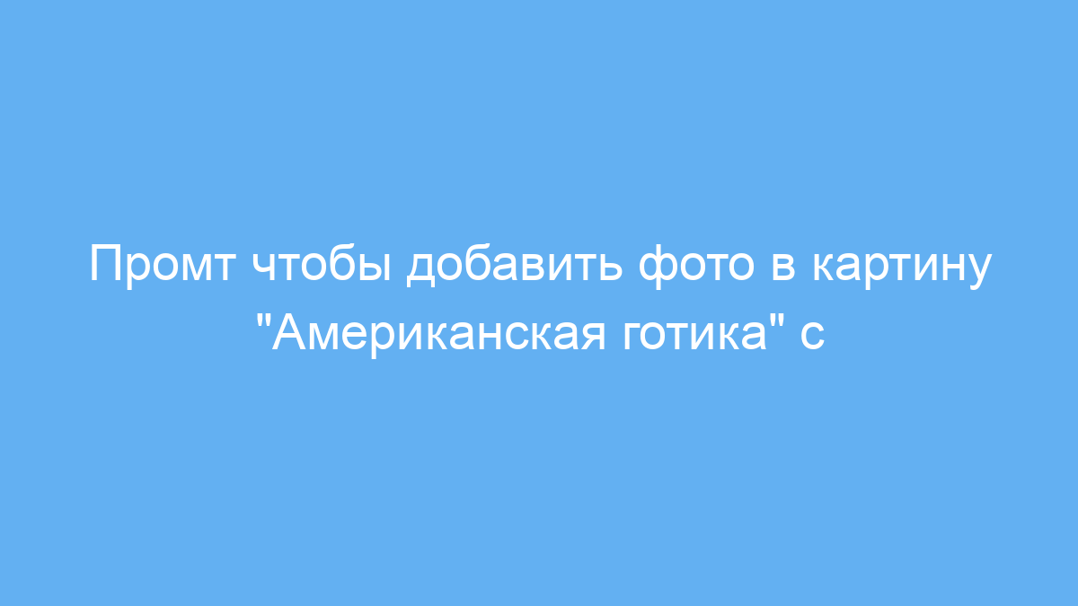 Этот промт предназначен для тех, кто хочет интегрировать своё фото в известную картину «Американская готика» художника Гранта Вуда. Он помогает создать уникальный художественный образ, сохраняя стиль сельского пейзажа и строгий реализм, характерный для оригинала. Промт полезен как для дизайнеров, иллюстраторов, так и для любителей нейросетей, желающих сделать творческие коллажи или оригинальные аватарки.