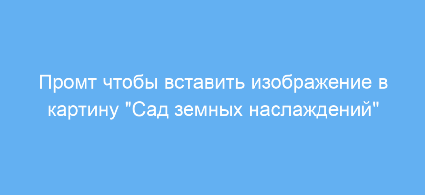 Этот промт подойдет художникам, дизайнерам и любителям искусства, которые хотят уникально обыграть своё изображение в стиле знаменитой картины Иеронима Босха «Сад земных наслаждений». С его помощью можно быстро создать сюрреалистичный коллаж, объединяющий личные фото с яркими и необычными элементами классического шедевра.
