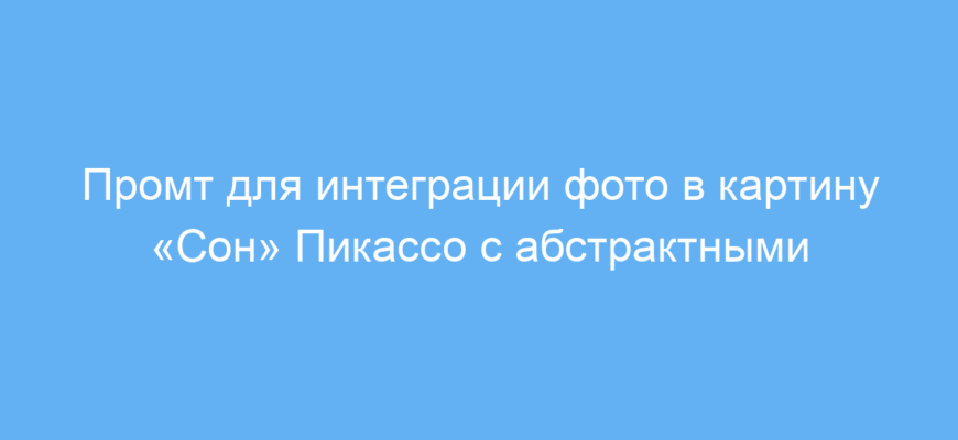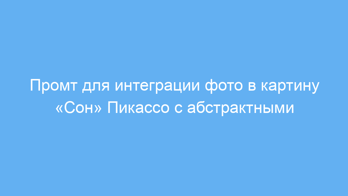 Данный промт предназначен для тех, кто хочет создать уникальное изображение, интегрировав своё загруженное фото в знаменитую картину Пабло Пикассо «Сон», дополненную яркими абстрактными формами и цветными пятнами. Это отличный инструмент для художников, дизайнеров, блогеров и всех творческих людей, желающих быстро получить необычный арт-объект без глубоких навыков работы с графическими редакторами.