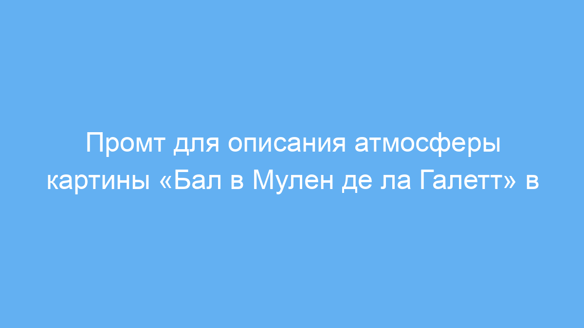 Принцип работы промта прост: он задаёт контекст (погружение в картину Ренуара), указывает стиль (импрессионизм), а также акцентирует внимание на деталях — яркости, движении и живости сцены. В результате нейросеть создаёт образное описание, соответствующее заданному художественному настрою.