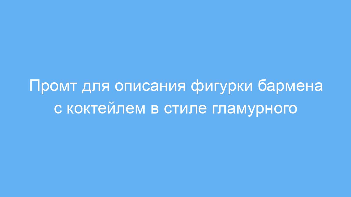 Данный промт облегчает создание качественного описания или запроса для генерации изображения игрушечной фигурки бармена в необычном стильном оформлении. Он экономит время на подбор слов и гарантирует стильный и лаконичный результат, который поможет в маркетинге, дизайне и творчестве.