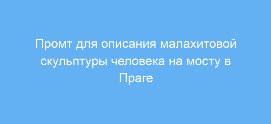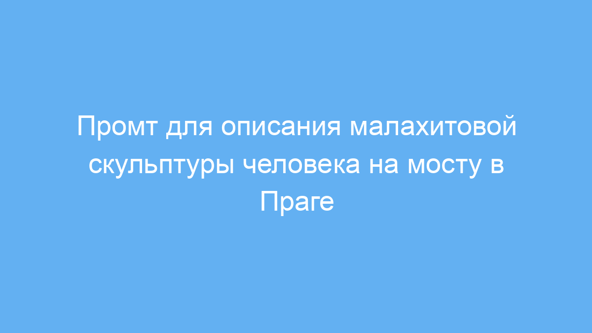 Работает промт следующим образом: пользователь вставляет желаемый текст в квадратные скобки [ТЕКСТ], и нейросеть генерирует описание, которое учитывает как особенности малахитовой скульптуры, так и атмосферу моста в Праге, создавая насыщенный и выразительный словесный образ.