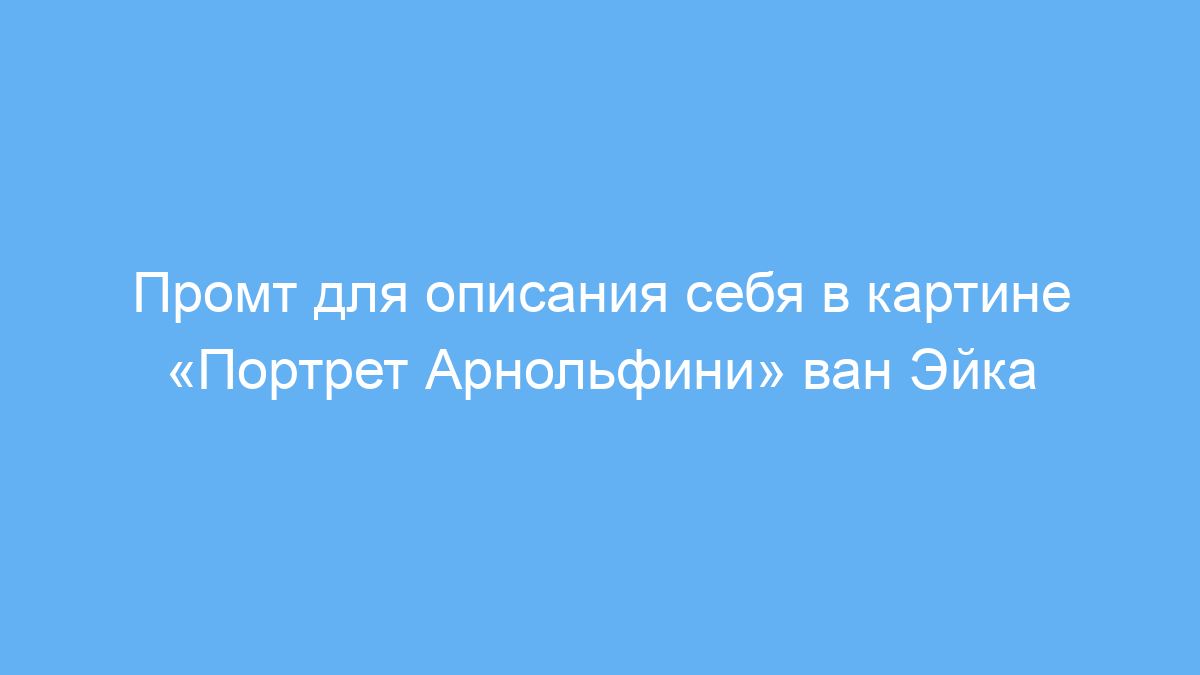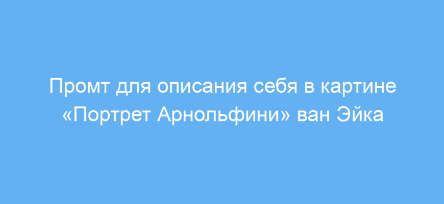 Этот промт предназначен для пользователей нейросетей, которые хотят создать текстовое описание себя в знаменитой картине Яна ван Эйка «Портрет Арнольфини». Его особенно оценят художники, писатели, студенты искусствоведения и просто любители живописи, стремящиеся понять и передать атмосферу и детали произведения.