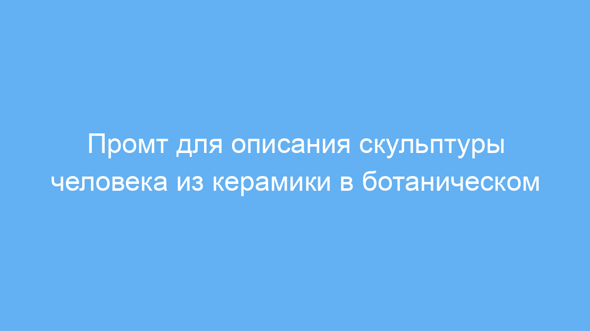 Этот промт предназначен для тех, кто хочет быстро и подробно создать описание керамической скульптуры человека, установленной в ботаническом саду Кейптауна. Он помогает художникам, экскурсоводам, журналистам и создателям контента грамотно и структурировано подать информацию о произведении искусства.