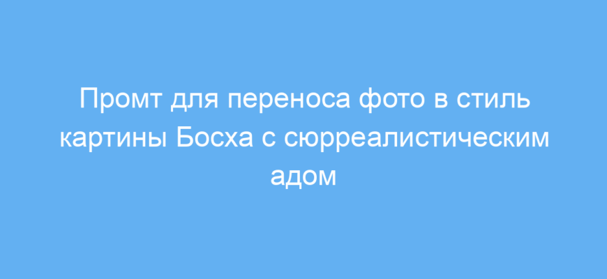 Задача — создать атмосферное изображение с элементами ада и мистики на основе портрета. Промт позволяет быстро получить эффект, напоминающий о живописи Босха и использовать результат в иллюстрациях или графическом дизайне.