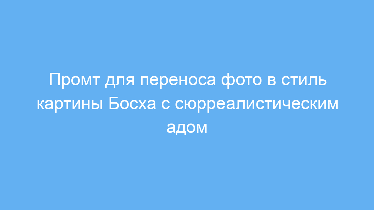 Этот промт предназначен для тех, кто хочет преобразить обычное фото в изображение, выполненное в стиле знаменитой картины «Сад земных наслаждений» Иеронима Босха. Он помогает создать сюрреалистическое, яркое и фантастическое произведение с мотивами ада и необычными деталями. Такой инструмент полезен художникам, дизайнерам, иллюстраторам и всем, кто работает с нейросетями для генерации креативного контента.