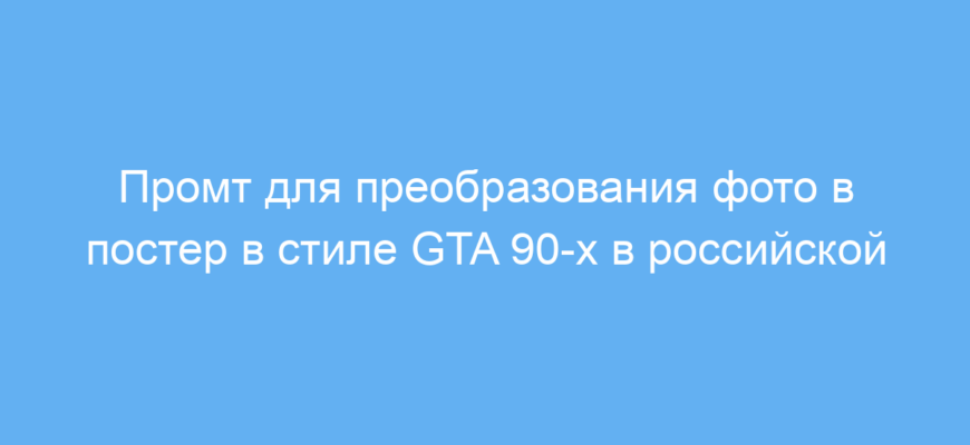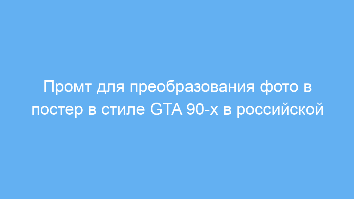 Этот промт позволяет быстро и удобно создавать уникальные постеры в популярном стиле GTA, адаптированные под российскую 90-х тематику. Он помогает сэкономить время на дизайне и гарантирует аутентичную атмосферу, которая повысит интерес к вашим проектам, рекламе или контенту.