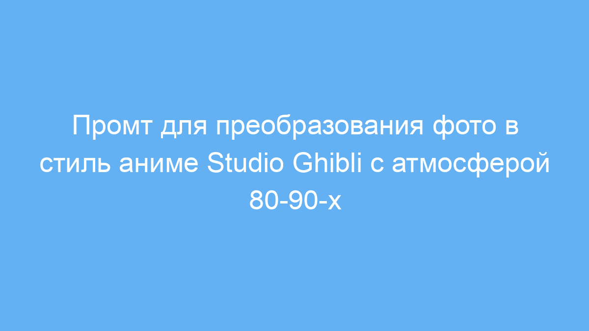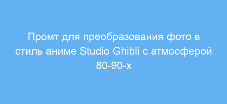Данный промт предназначен для всех, кто хочет превратить обычное фото в атмосферное изображение в стиле аниме легендарной студии Studio Ghibli, дополненное ностальгической атмосферой 80-90-х годов. Это полезный инструмент для дизайнеров, художников, контент-криэйторов и любителей аниме, которые хотят быстро создавать уникальные визуальные эффекты без сложного редактирования.