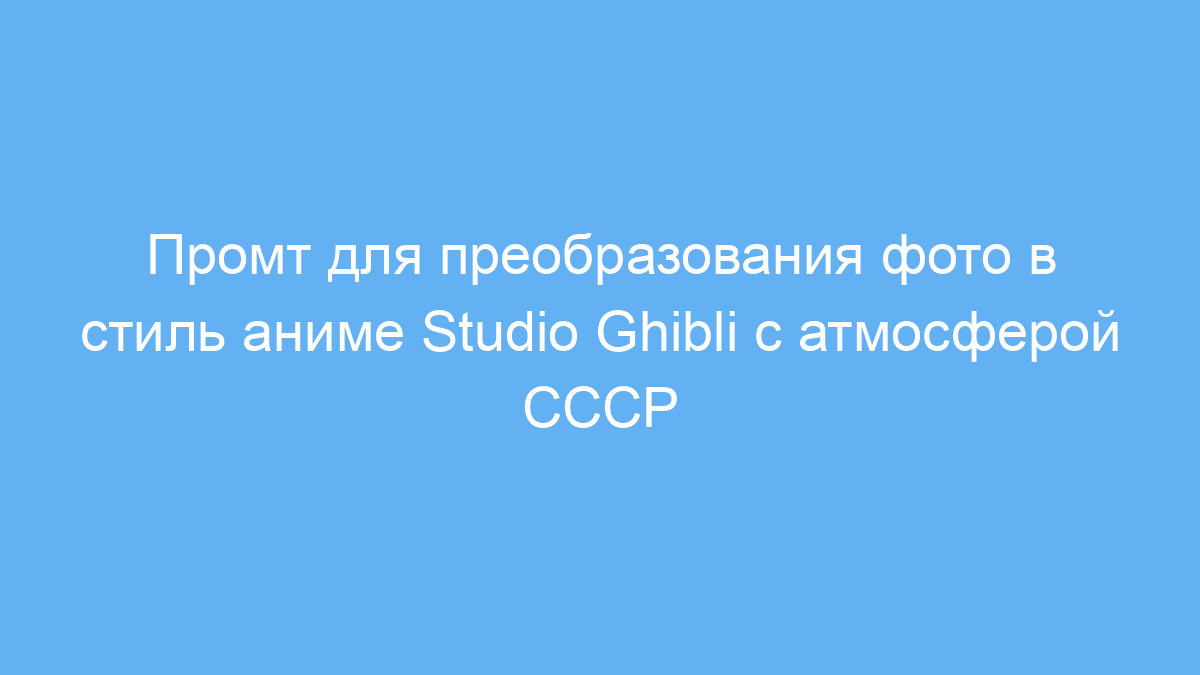 Этот промт создан для тех, кто хочет преобразовать обычное фото в уникальное изображение в стиле аниме, вдохновляющееся атмосферой СССР и классическим образом. Он отлично подходит для художников, дизайнеров, блогеров и всех, кто работает с визуальным контентом и хочет добавить ностальгический, художественный эффект в стиле Studio Ghibli.