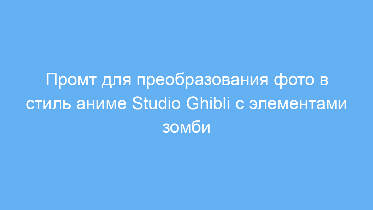 Этот промт предназначен для пользователей нейросетей, которые хотят получить уникальные изображения, сочетающие в себе анимационный стиль Studio Ghibli и атмосферу зомби. Он отлично подходит художникам, дизайнерам, блогерам и любителям необычных визуальных эффектов, которые хотят быстро создать эффектную картинку с ретро-настроением и тропическим фоном. Такой промт решает задачу преобразования обычной фотографии в художественное произведение с четко заданным стилем и настроением.