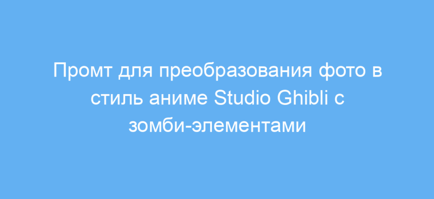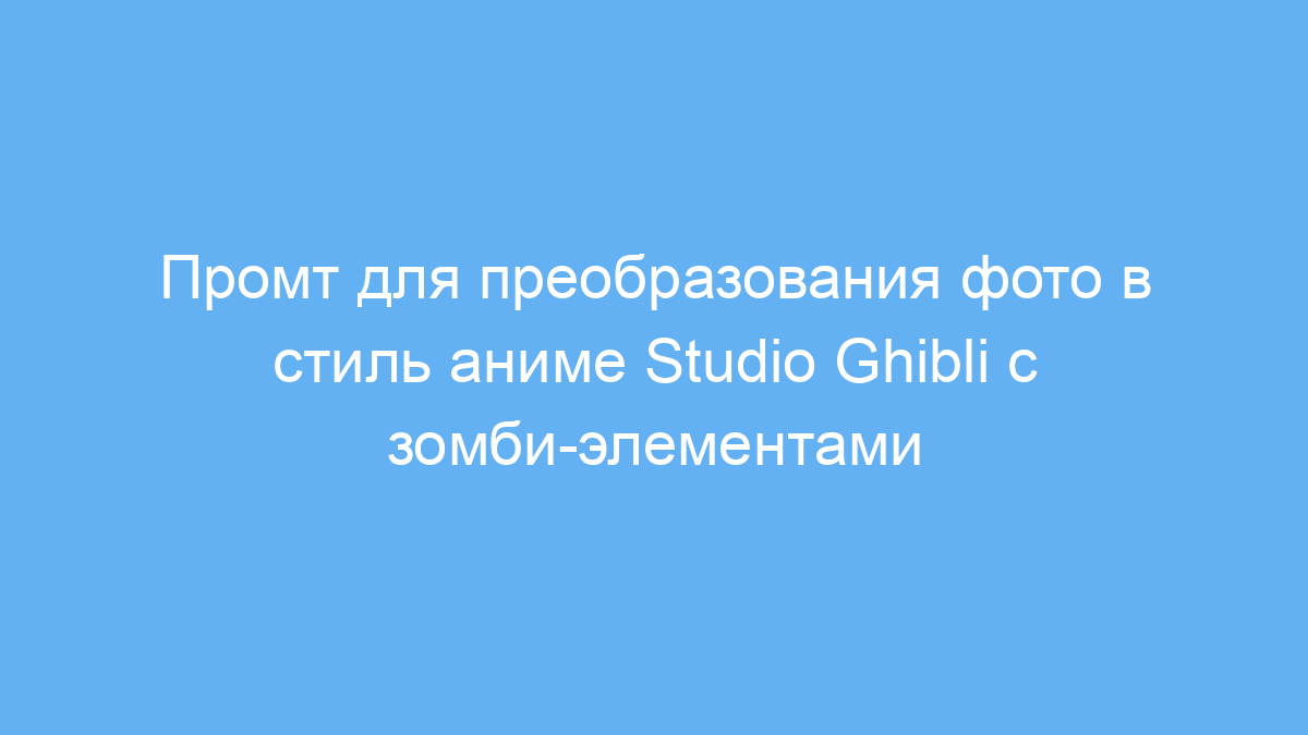 Промт помогает решить задачу стилизации фотографии, создавая сочетание теплой и мягкой эстетики, характерной для Studio Ghibli, с необычной тематикой зомби. Такой подход подойдет для креативных проектов, постов в соцсетях, иллюстраций для историй, игр или же просто для вдохновения.