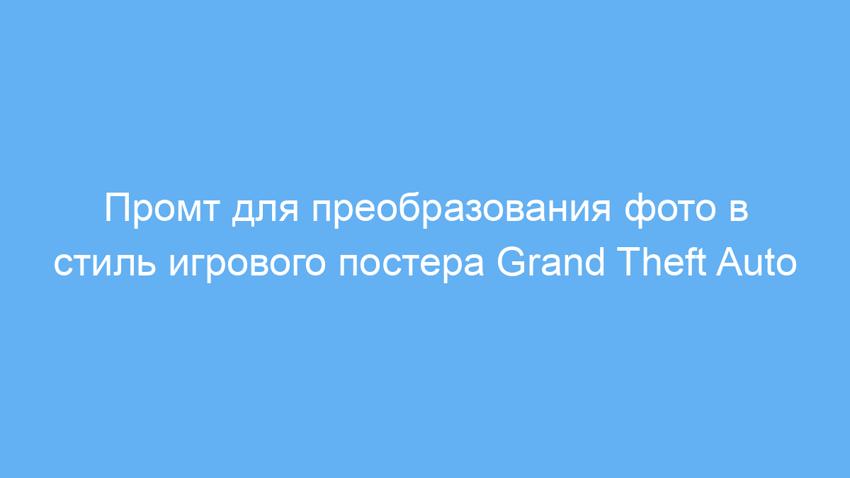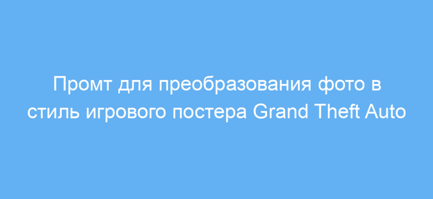 Этот промт предназначен для дизайнеров, маркетологов, иллюстраторов и всех, кто хочет быстро создать уникальные изображения в стиле классической серии видеоигр Grand Theft Auto (GTA). Особенно полезен он тем, кто работает с визуальным контентом, создаёт рекламные материалы или развлекательные посты с винтажной атмосферой. Использование промта позволяет преобразовать обычную фотографию в художественный постер с узнаваемой эстетикой GTA, что делает изображение эффектным и привлекательным.