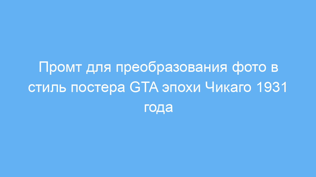 Данный промт упрощает процесс создания художественных изображений в уникальном стиле Grand Theft Auto с атмосферой 30-х годов. Он помогает быстро получить качественный визуальный контент с минимальными усилиями и без глубоких дизайнерских навыков.