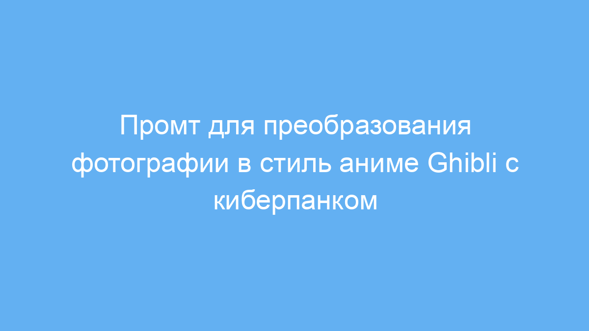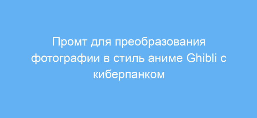 Этот промт предназначен для тех, кто хочет преобразить обычную фотографию, превратив её в уникальное изображение в стиле аниме легендарной студии Ghibli с добавлением элементов киберпанка и центральной темой виртуальной реальности.