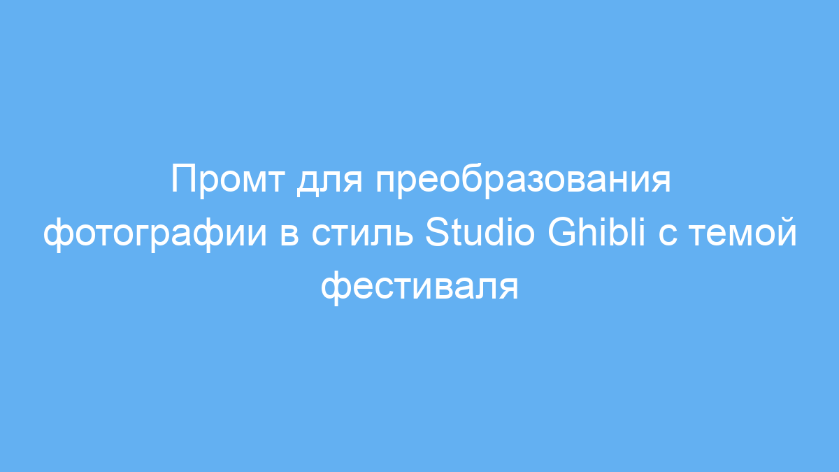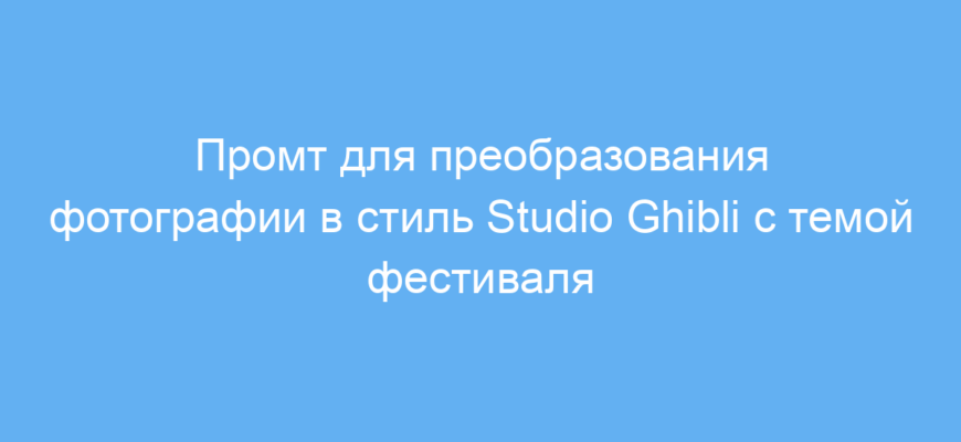 Этот промт предназначен для тех, кто хочет легко и быстро превратить обычные фотографии в красивые иллюстрации, стилизованные под знаменитую анимацию Studio Ghibli. Особенно он полезен дизайнерам, блогерам, иллюстраторам и всем, кто хочет создать уникальные яркие изображения с атмосферой японского фестиваля фонарей.
