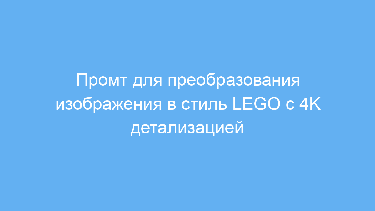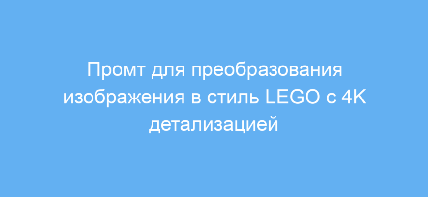Суть работы промта в том, что нейросеть полностью перерабатывает исходное изображение, повторяя его форму и цвета, но заменяя все элементы на LEGO-кирпичики с пластиковой текстурой и блеском. Детализация создается в высоком разрешении 4K, что обеспечивает четкость и насыщенность картинки.
